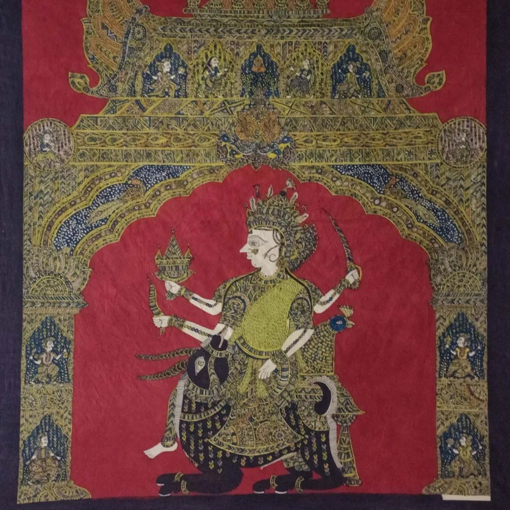 Mata Ni Pachedi is a sacred folk art practiced by the nomadic Vagharis community in Gujarat. The community traces their association with this art to three centuries ago. It is also known as the Kalamkari of Gujarat. It translates to “Marakhadi”. These Pachedis are an expression of the divine energy of the mother goddess. When the people of the Vaghari community were barred from entering the temples, they made their own shrines with various depictions of the Mother Goddess on the cloth.