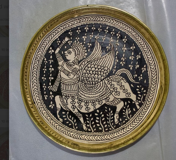The Painting is a folk art by Ajit and her family of artisans in Gujarat who once belonged to a nomadic tribe. Since these are all handmade, certain imperfections might be visible but be assured that these only add to the handcrafted look of the Mata Ni Pachedi Brass wall plate painting. Bring a piece of generational tradition to your homes and spaces. The paintings are hand-made and hence your order may take 10-12 days to be made and then couriered to you safely. You can also preorder any Mata Ni Pachedi painting or saree via our website or email.