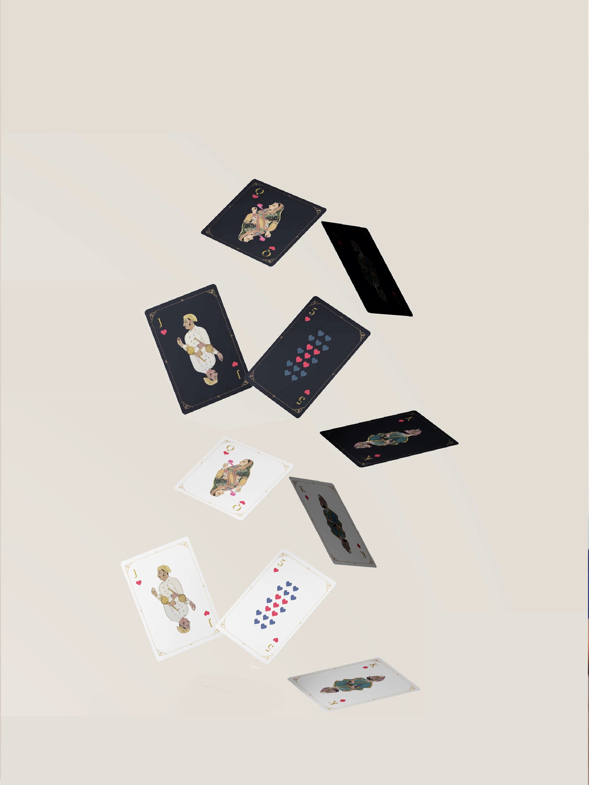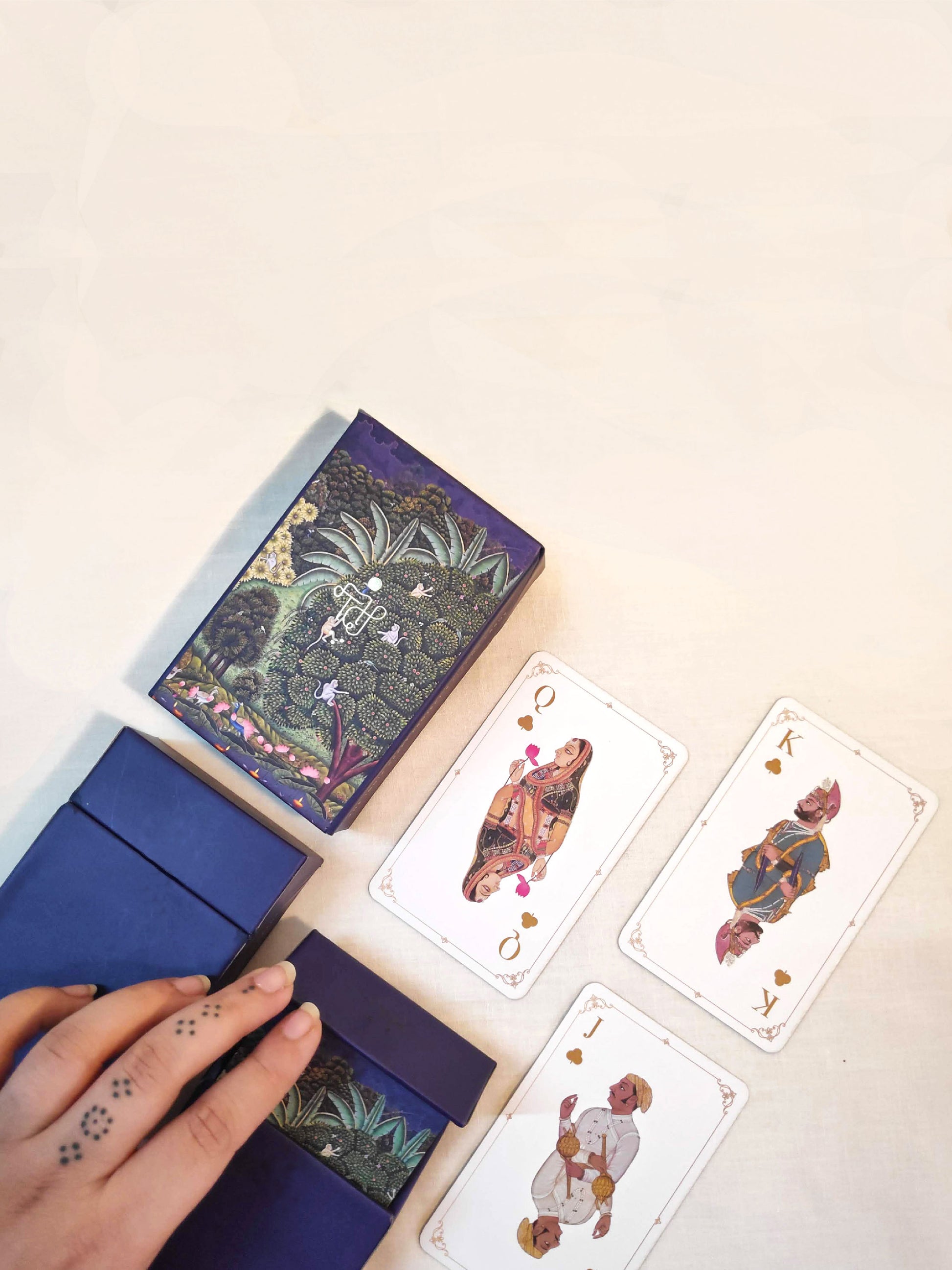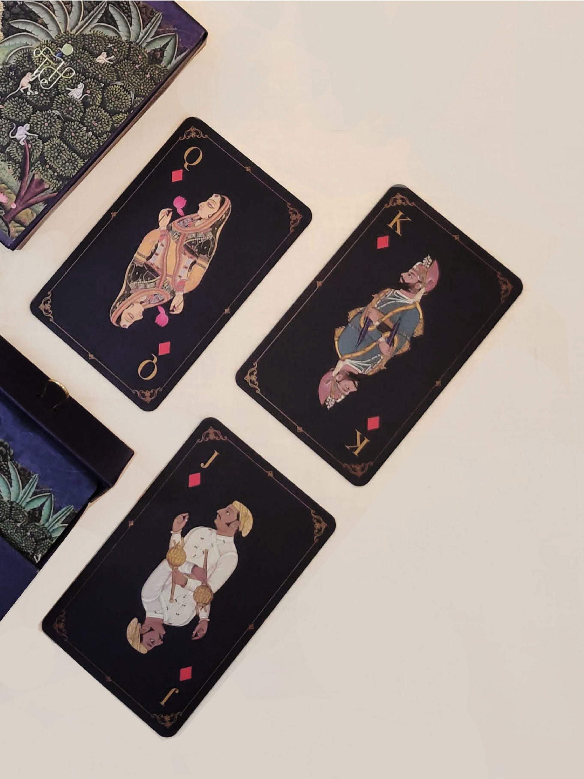 The commissioned artwork showcases playful, adventurous monkeys in the dense forests of India, with a quaint midnight scenery. The Raja, Rani, Garuda (Joker) add to the charm of the 'Rajasthani Miniature' style of art, specially designed to bring this deck to life.