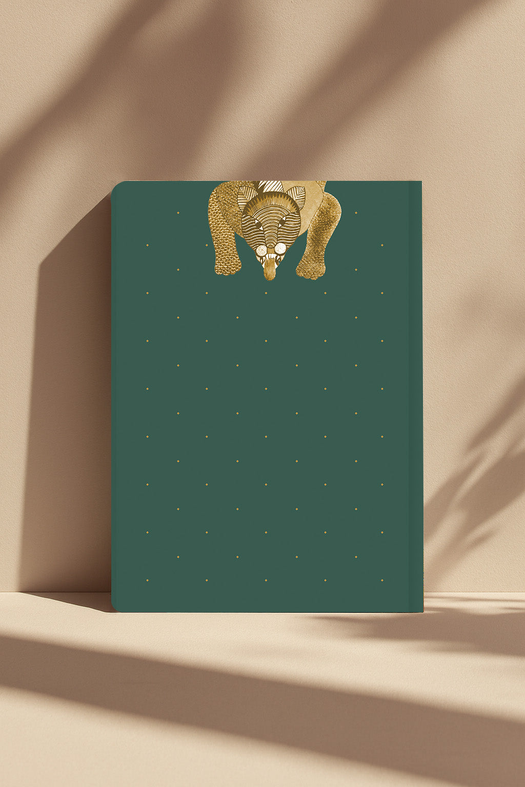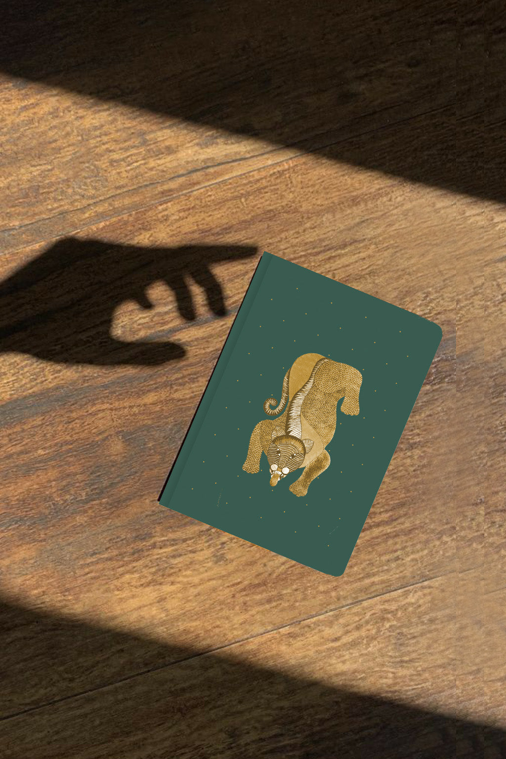 This diary in Gond art has a striking golden feline on dark green, drawn in intricate Gond line and Gond pattern work.