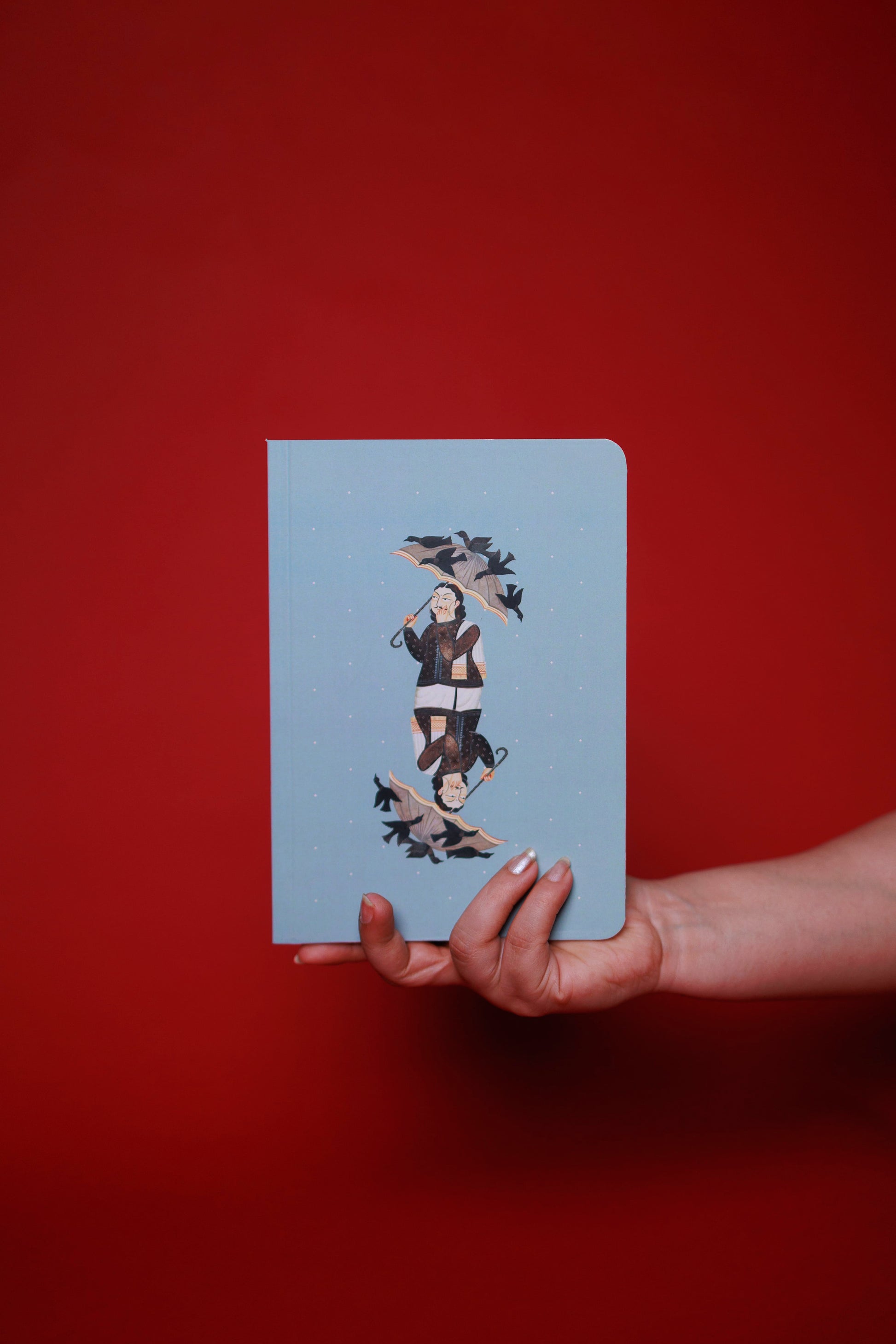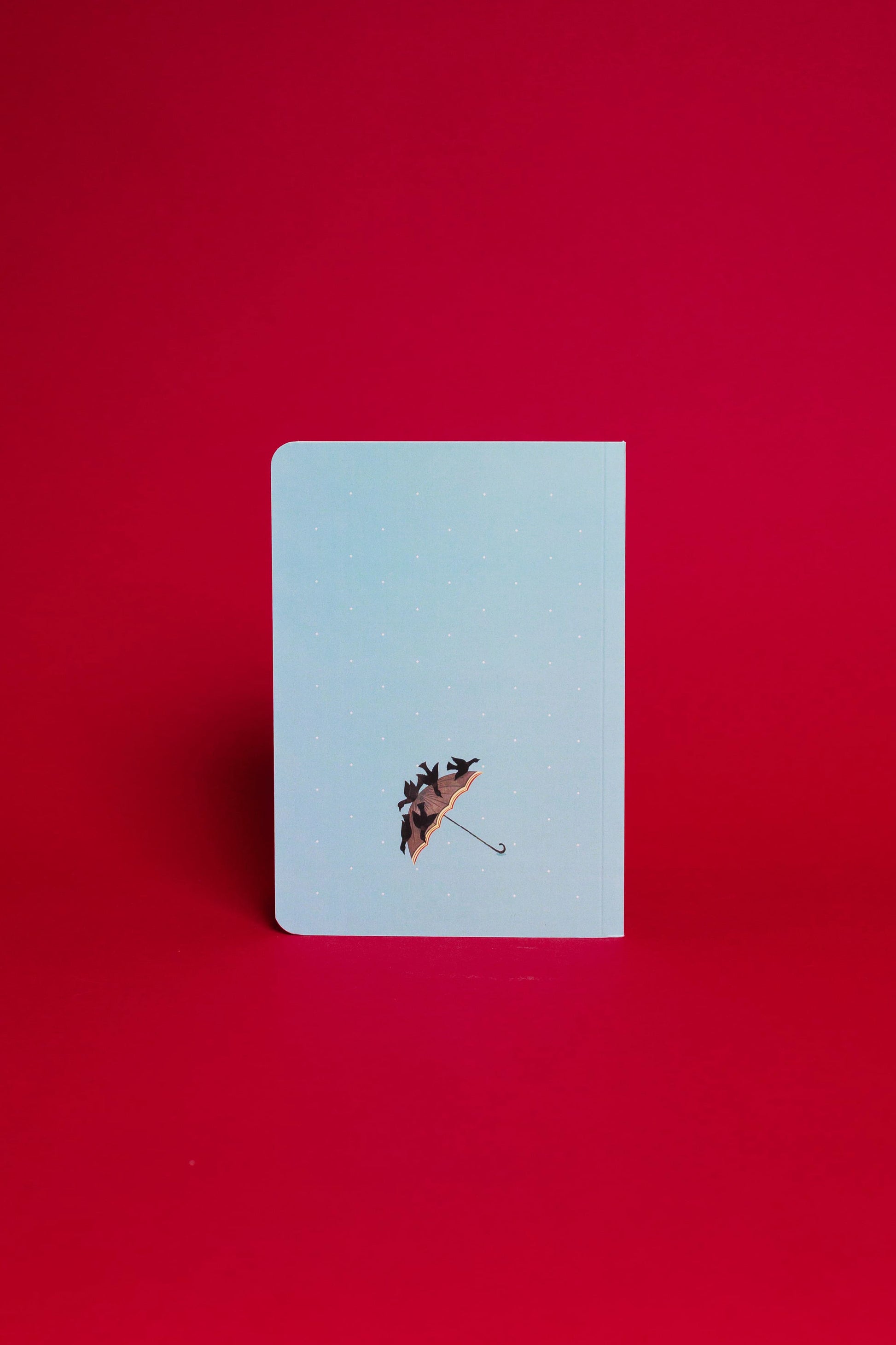 This diary in Kalighat art has The Umbrella Man. A pensive man holding an umbrella surrounded by black crows, sky blue background.