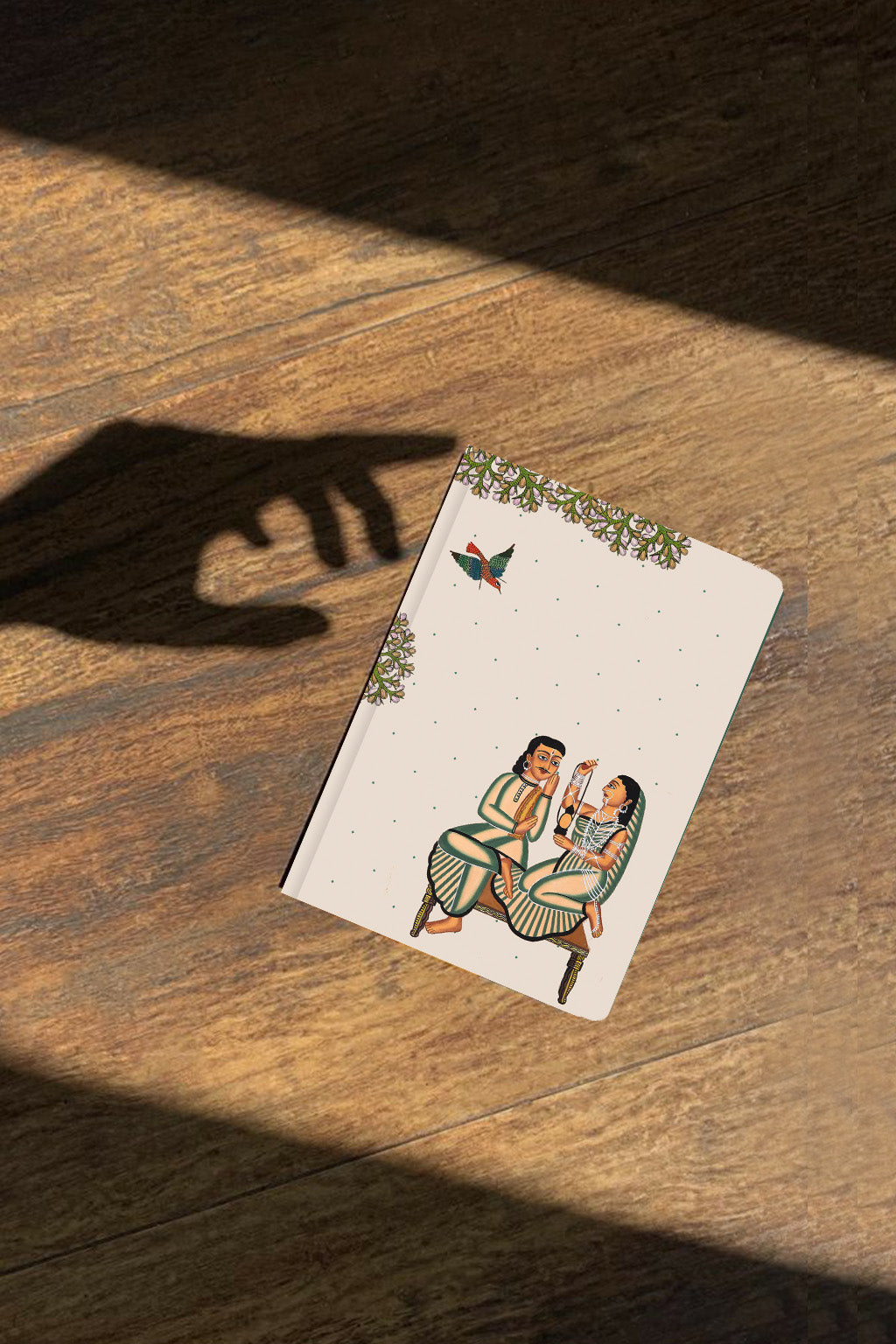 This diary in Kalighat art has Courtship in Bloom. A Playful couple under blossoming trees with a flying parrot above.