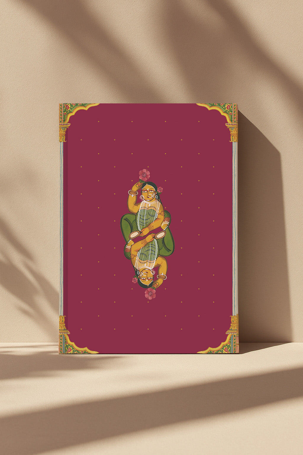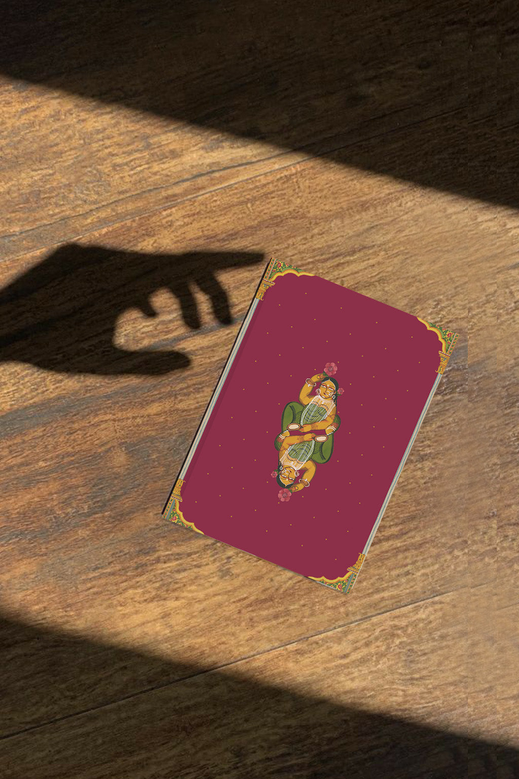 This diary in Kalighat art has a woman holding hibiscus flowers on a rich magenta backdrop.
