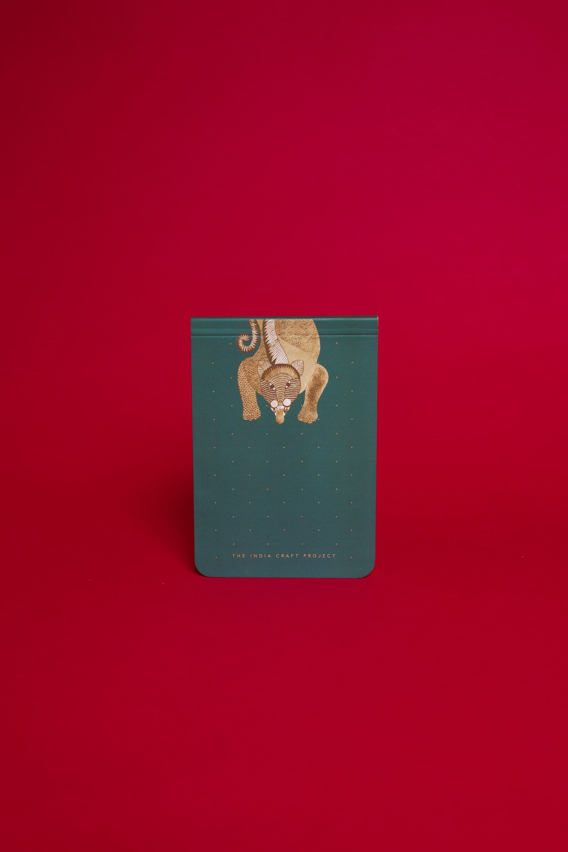 This notepad in Gond art has a striking golden feline on dark green, drawn in intricate Gond line and Gond pattern work.