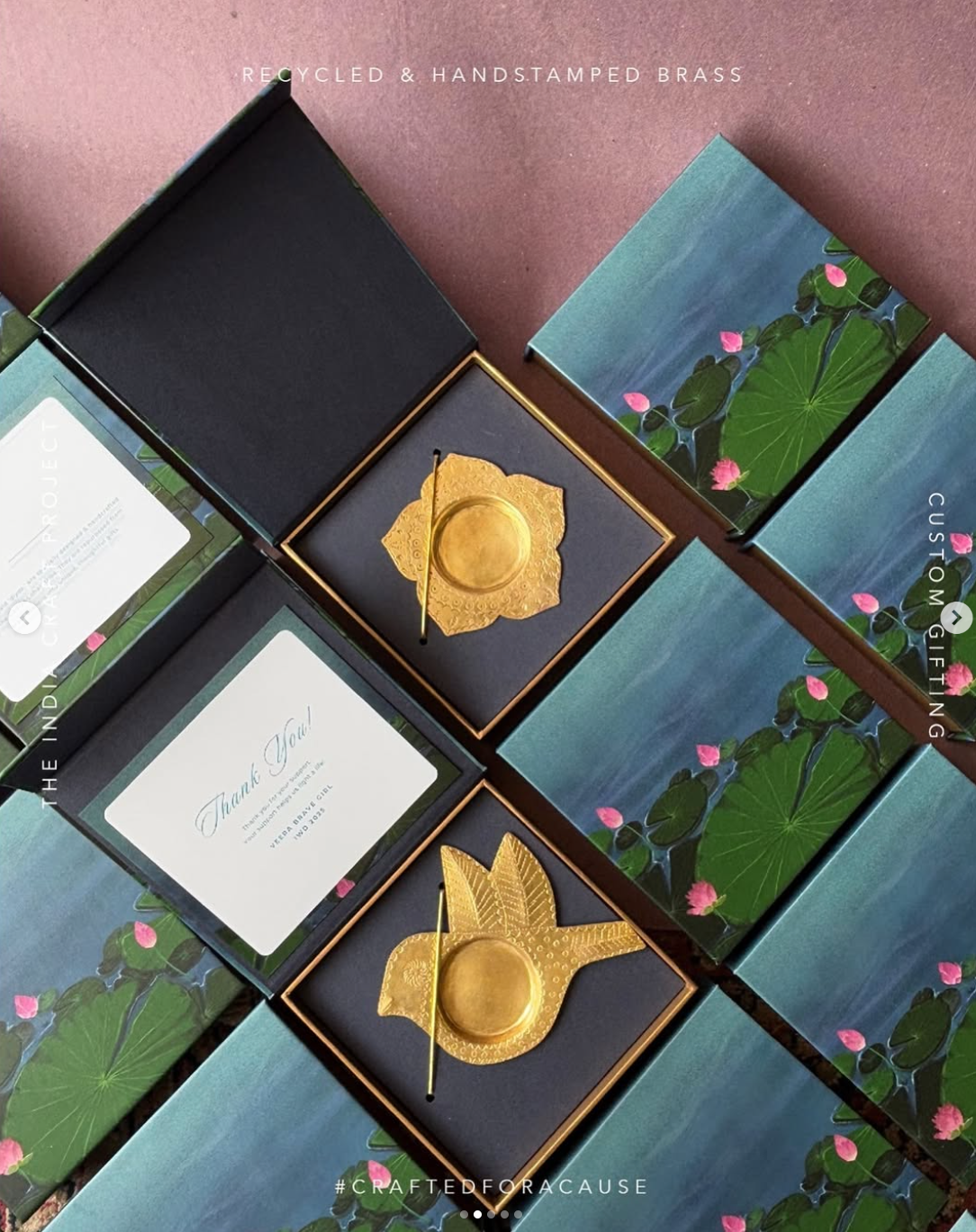 This exquisite 5 x 5 x 1 Inch gift box, showcases a lotus pond illustration with our logo - and holds a beautiful brass tea-light holder. This is made in Gujarat, recycled brass and hand punched for the pattern you see on them. Extremely lightweight but all you need to light up your space and makes for a perfect personal gift. Add this to your cart to add warmth to your gifts especially for our tea-lights!