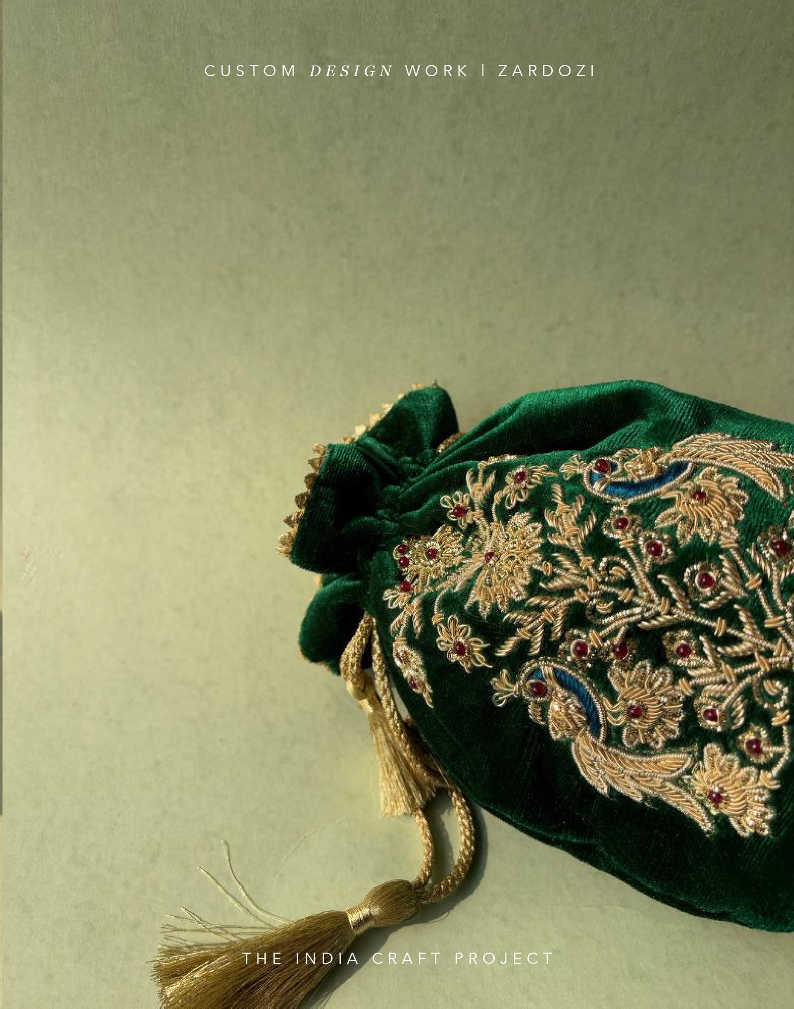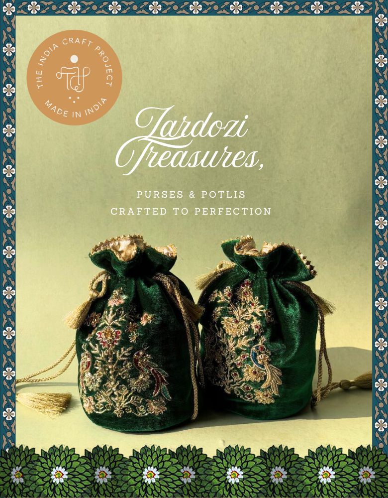 Indulge in the exquisite beauty of our hand-embroidered velvet 'Mor' Zardozi Potli, adorned with semi-precious stones and intricate zardozi work on green velvet. This masterpiece showcases the vivid flower bouquet with peacocks in the design, inspired by the Mughal floral work see in mughal architecture. Reflecting light with every stitch, this potli preserves the royal tradition of Zardozi, a craft that once used real gold and silver threads and continues today with fine metallic embroidery on luxurious fabrics.